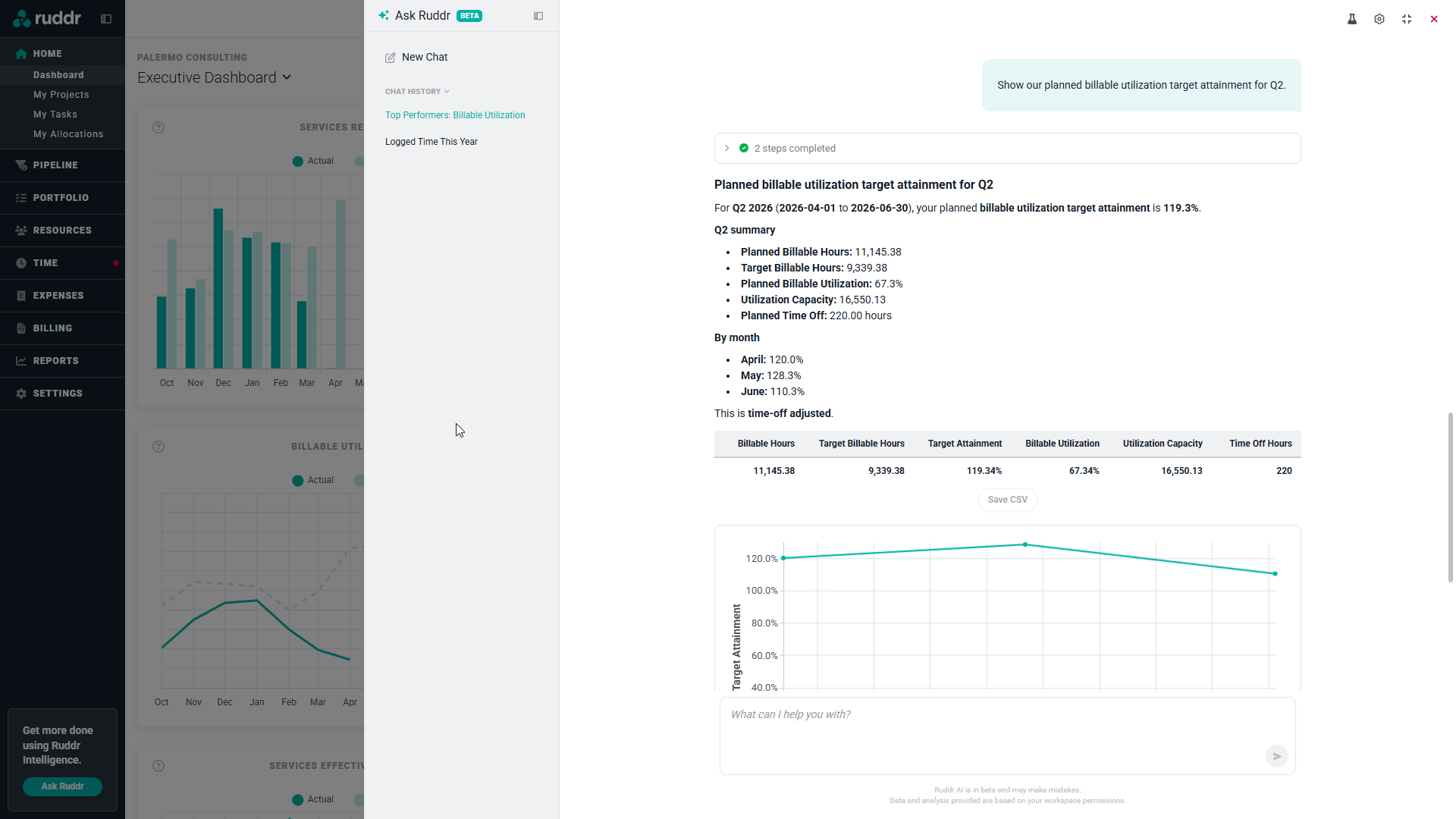 Just click "Ask Ruddr" and start a conversation with your own business data. For executives especially, this eliminates the need to know which dashboard or screen to consult — the Assistant brings the answer to you.